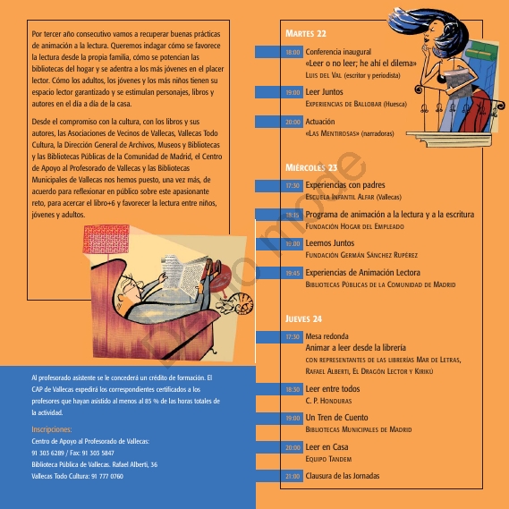 Desde el compromiso con la cultura, con los libros y sus autores, las Asociaciones de Vecinos de Vallecas, Vallecas Todo Cultura, La Dirección General de Archivos, Museos y Bibliotecas, las Bibliotecas Públicas de la Comunidad de Madrid,el Centro de Apoyo al Profesorado de Vallecas y las Bibliotecas Municipales de Vallecas nos hemos puesto, una vez más, de acuerdo para reflexionar en público sobre este apasionante reto, para acercar el libro y favorecer la lectura entreniños, jóvenes y adultos.